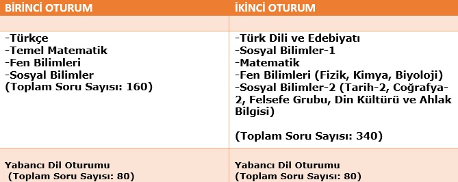 Birinci oturum TYT de sadece beceri ve yetenek testlerinden oluşan sorulardan oluşacaktır. Ayrıca Türkçe testinde Sosyal bilgiler derslerinin konuları paragraf olarak verilecek ve anlamı, verilmek istenen, anlatılmak istenen soru cümleleri ile okuduğunu anlamayı ölçmeyi hedeflemektedirler. Aynı şekilde de Matematik dersinde Fen Bilimleri dersleri ile ilgili atıflar yapılacaktır. Konular daha çok 9. Sınıf öğretim programı paralelinde şekillenecektir. Soruların zorluk derecesi oldukça düşük olacaktır. Yani sorular genel anlamda kolay olacaktır. Önceki yıllara göre doğruluk ortalamalarında da artış gözle görülebilecek artışlar gözlenecektir.