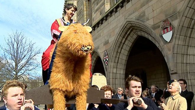 Aberdeen Üniversitesine yeni bir rektör atandığında, geleneğe göre rektör, öğrenci maskotu Angus the Bull tarafından yüksek caddeden aşağıya, öğrenci destekçileri için içki alacağı bir bara götürülür.