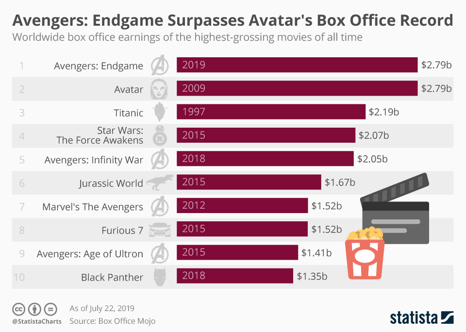 2019 yılında vizyona giren Avengers: Endgame en çok gişe yapan film rekorunu elinde tutuyor bunun dışında en çok izlenen beşinci film rekoruna da sahip. Filme ayrılan bütçe 356 milyon dolar olurken gişe hasılatı ise 2.8 milyar dolar olmuştur ve bununla birlikte Avatar filmini geride bırakmıştır.