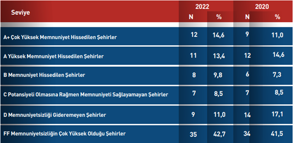 Seviye tablosuna göre yüksek memnuniyet hissedilen şehirler A+ puan almaktadır ve bu şehir sayısı 2020 yılında 9 iken 2022 yılında 12 olmuştur. Memnuniyetsizliği gideremeyen şehirler ise D puanı ile gösterilmiş olup sayıları 2020 yılında 14 iken 2022 yılında 9’a düşmüştür. Diğer sayılarda ise çok değişiklik olmamıştır.