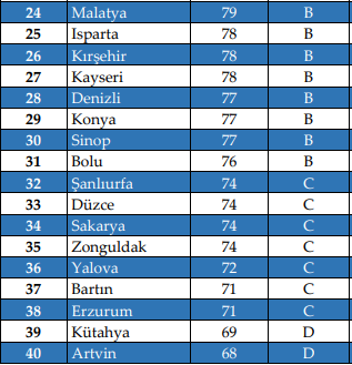 Listeye baktığınızda İstanbul'un iki farklı yaka olarak değerlendirildiğini görebilirsiniz. Listedeki tüm şehirler A+ puan almışlardır. A+ puan alan toplam 12 şehir vardır ve diğer iki şehir ise 85 puan alan İzmir ve Adana şehirleridir. 2020 yılı sıralamasında İzmir, Adana ve Muğla şehirleri A+ puan alamamıştır fakat 2022 yılında memnuniyet düzeylerini artırmayı başarmışlardır.