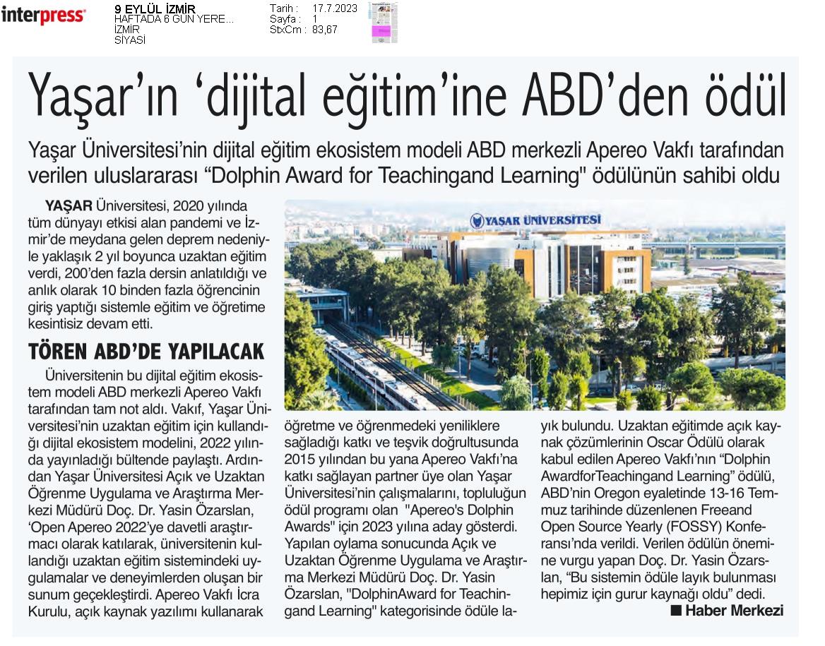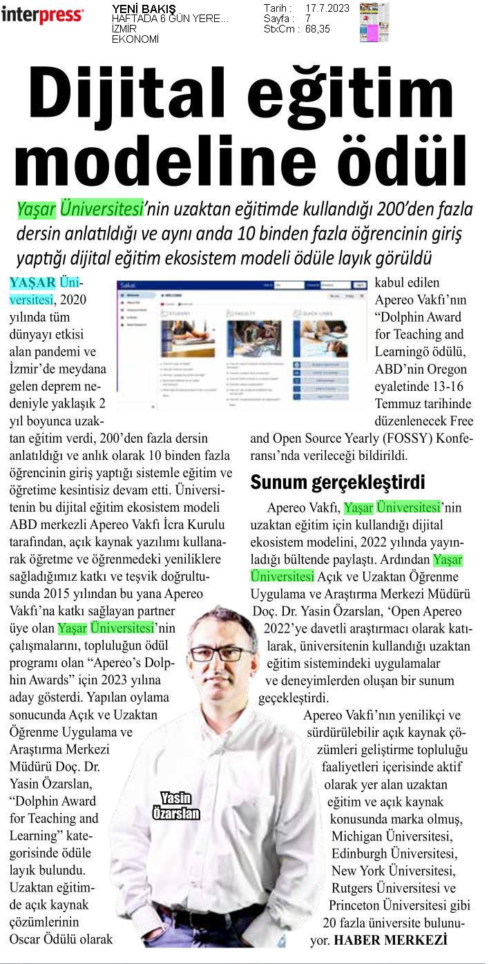 Yaşar Üniversitesi, uzaktan eğitimde kullandığı dijital eğitim ekosistem modeli sayesinde uluslararası bir ödüle layık görüldü. Pandemi döneminde 10 binden fazla öğrencinin aynı anda katıldığı ve 200'den fazla dersin anlatıldığı bu model, ABD merkezli Apereo Vakfı tarafından düzenlenen "Dolphin Award for Teaching and Learning" ödülünü kazandı. Bu vakıf, uzaktan eğitim ve açık kaynak konusunda otorite olan bir topluluk ve içinde saygın üniversiteler yer alıyor.