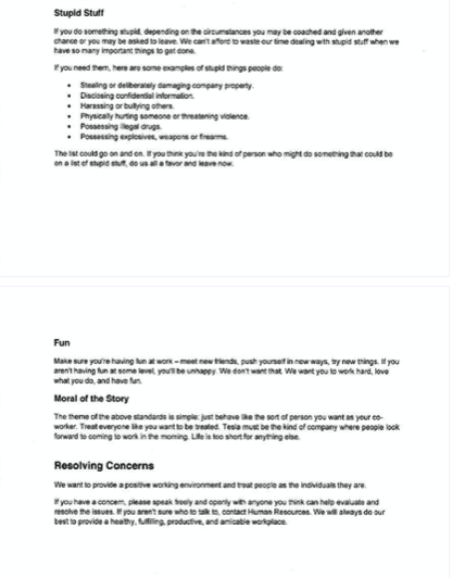 İlk olarak Business Insider tarafından bildirilen sızan belge bize Tesla'nın çalışanlarının kendi kendine dirençli olmalarını ve çizgiyi aştıklarını hissettiklerinde bile açıkça iletişim kurmayı nasıl beklediğini görüyor.